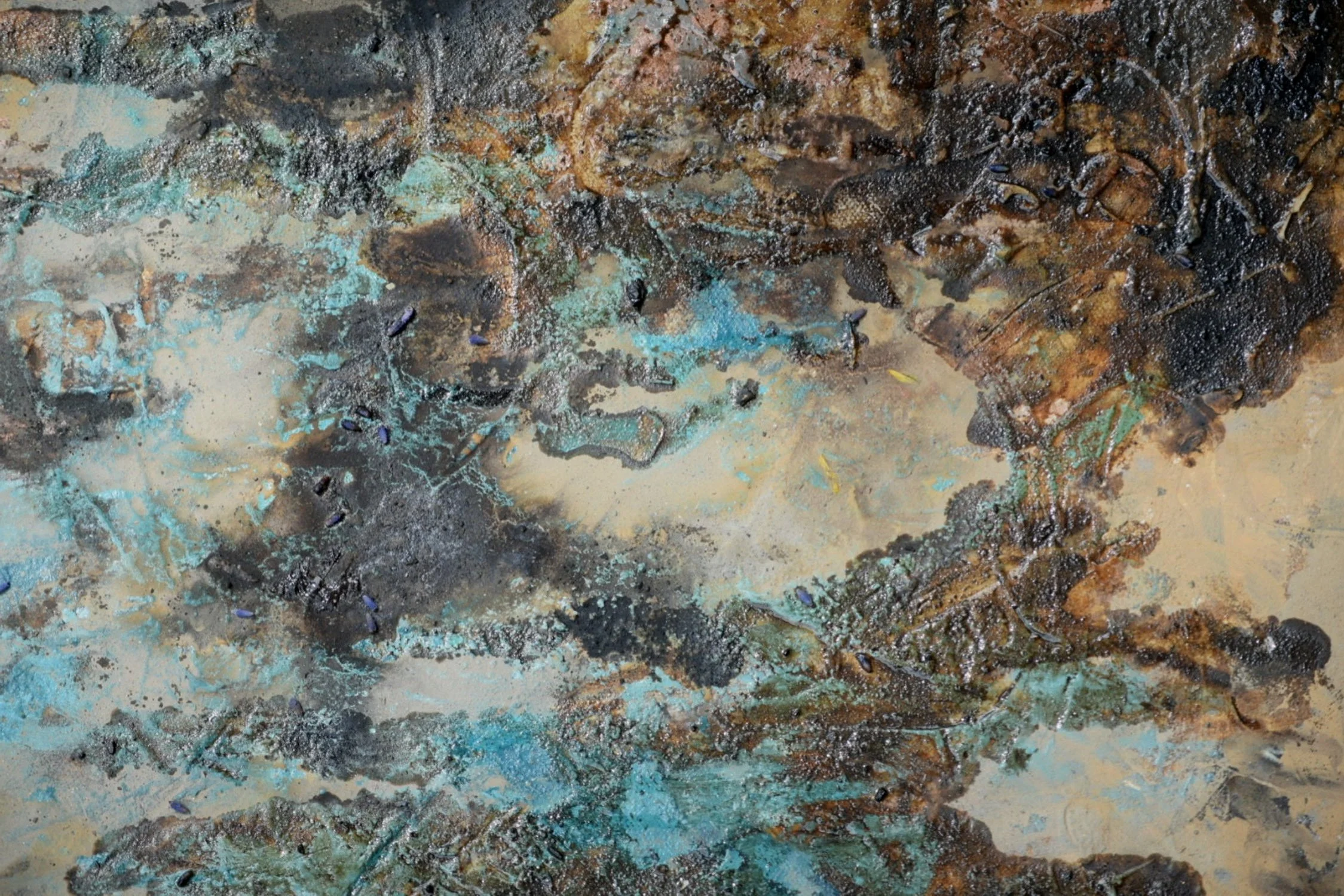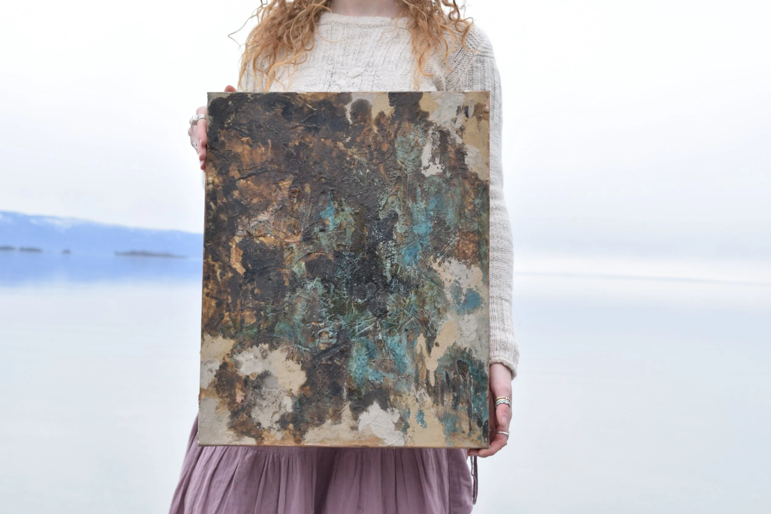 This piece is made from coastal Oregon mud, ash from burnt birch, charcoal from pine, Inky Cap mushroom ink, turquoise and copper oil paint; topped with linseed oil, Lavender sprigs, St John’s Wort petals, and a butterfly wing found in a dry reservoir in Montana.