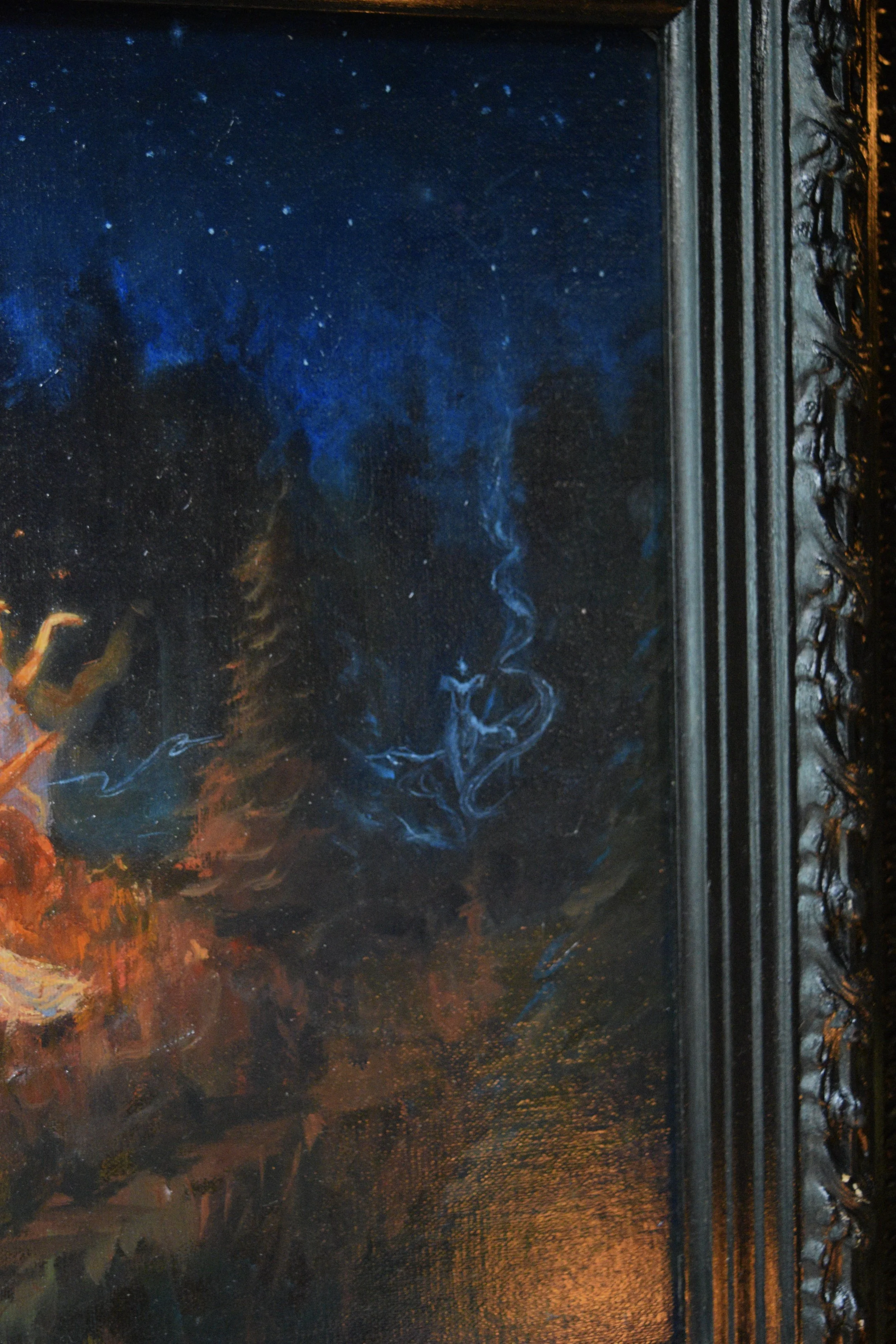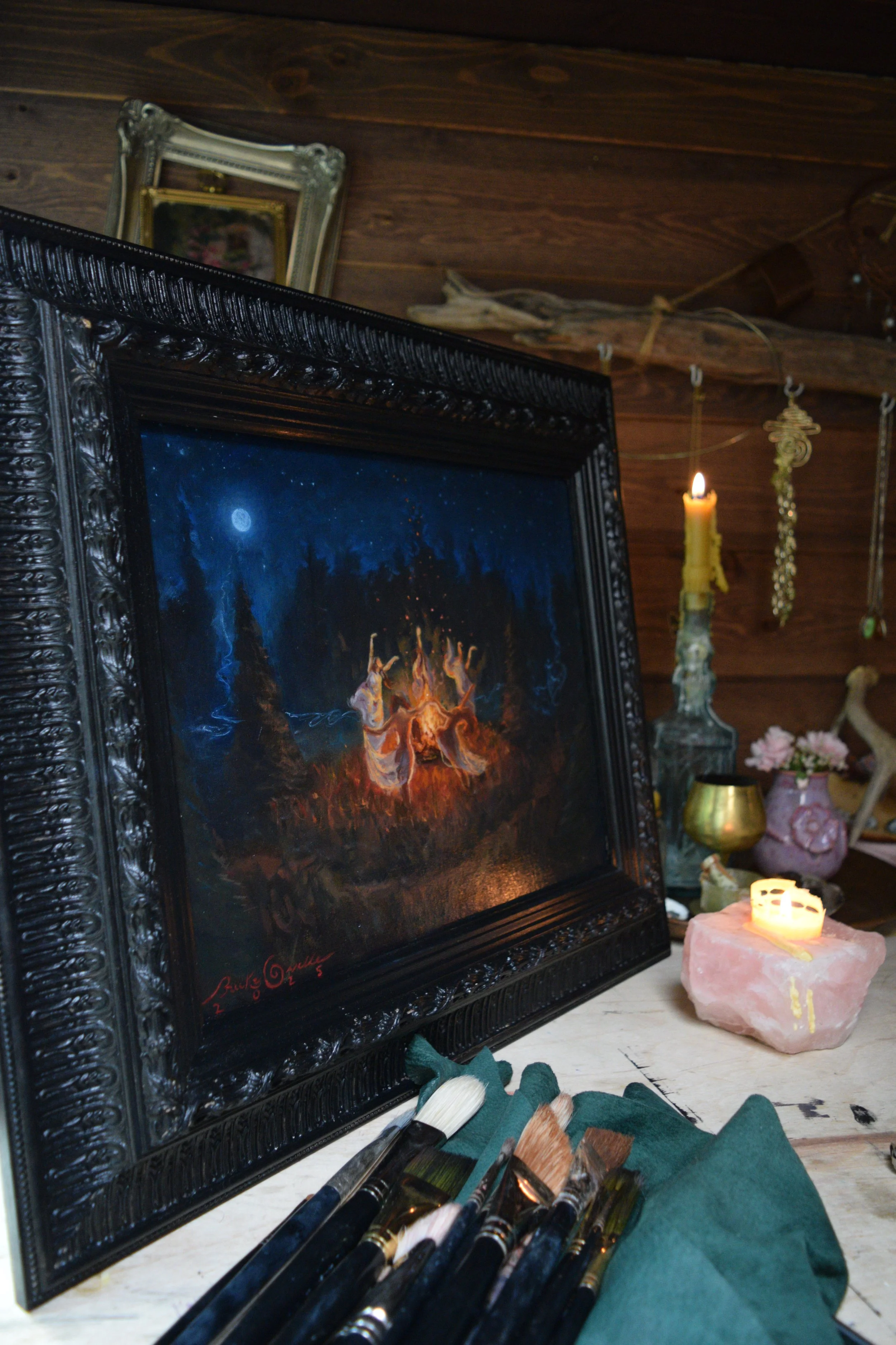Each time I ventured into this painting I changed the moon to match the phase in the waking world, cresent, new, making sure to finish it under the glowing full light.